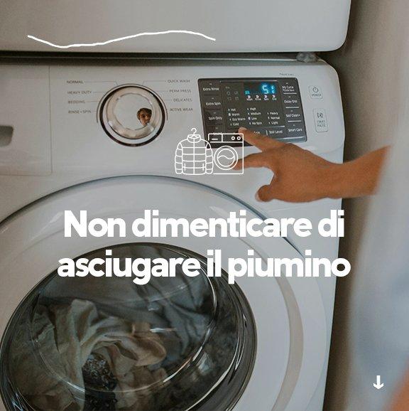 • Aggiungi un detersivo specifico per piumini; evita il sapone classico o ammorbidenti.