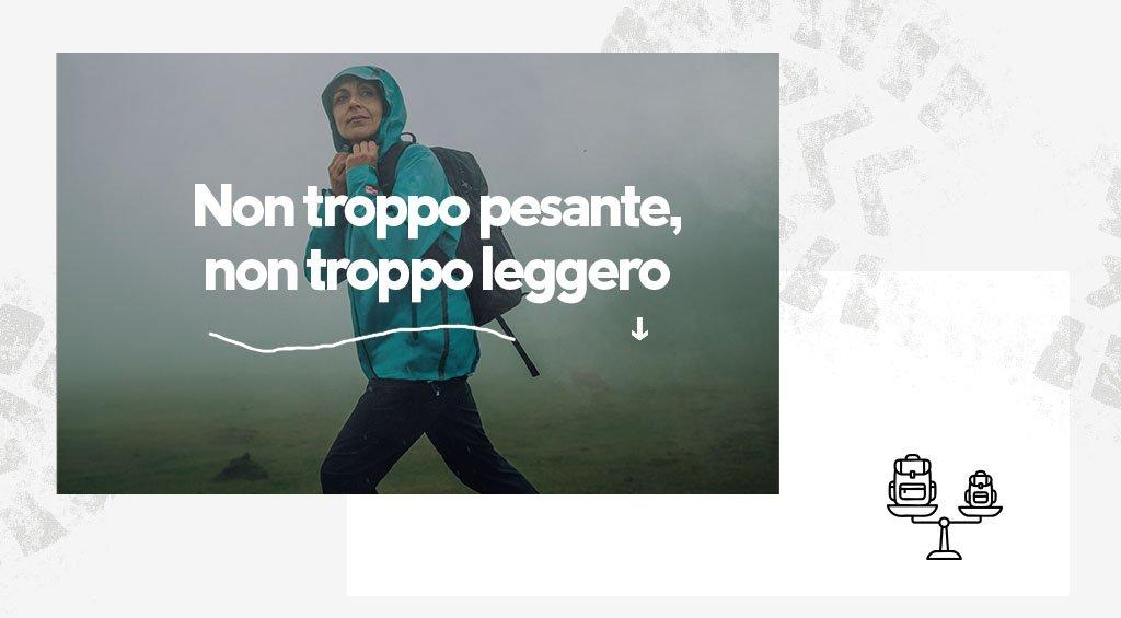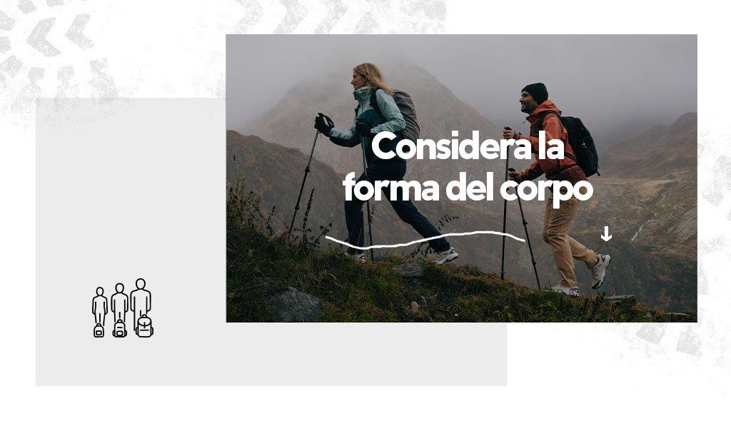 Uno zaino da escursionismo di buona qualità deve essere resistente per non rompersi, ma anche leggero per essere facile da trasportare. La chiave è trovare il giusto equilibrio! Uno zaino da escursionismo adatto alla tua conformazione riduce l’affaticamento e previene gli infortuni. La vestibilità si basa sulla lunghezza del busto e sulla circonferenza dei fianchi, non sull’altezza.