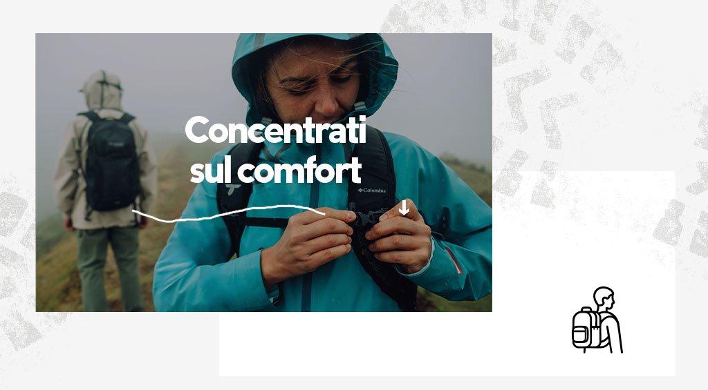 Misura la lunghezza del busto e la circonferenza dei fianchi. Lo zaino deve poggiare comodamente sui fianchi, mentre gli spallacci devono essere ben aderenti senza però reggere la maggior parte del peso. Usa la cintura ventrale e la cinghia sternale per distribuire meglio il carico.